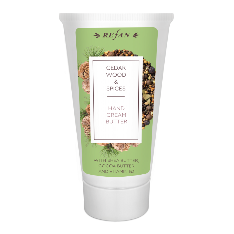 Crème beurre pour les mains à la texture légère, douce comme de la soie pour un soin quotidien. La vitamine B3 et les beurres végétaux naturels de carité et de cacao nourrissent et en même temps hydratent la peau des mains, tout en éliminant les zones sèches et calleuses. Possède une odeur chaude boisée de cèdre, d’agrumes frais et d’épices.